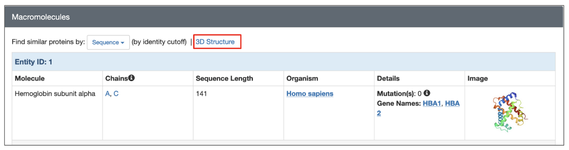 All 3D structures available from the RCSB.org (experimental structures and CSMs) have a dedicated Structure Summary page that displays information about the entities and assemblies of that entry. To search for structures similar to any one polymer entity in the structure click on the “Structure” link above the details listed for the macromolecule (Figure 4).
