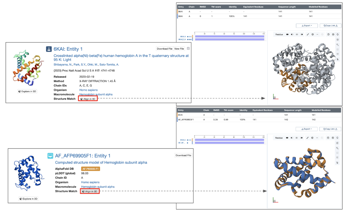 For entity based searches, each matched entity can be superposed on the query entity and viewed in 3D using the pairwise alignment tool by clicking on the View button next to “Structure Match” (Figure 8).